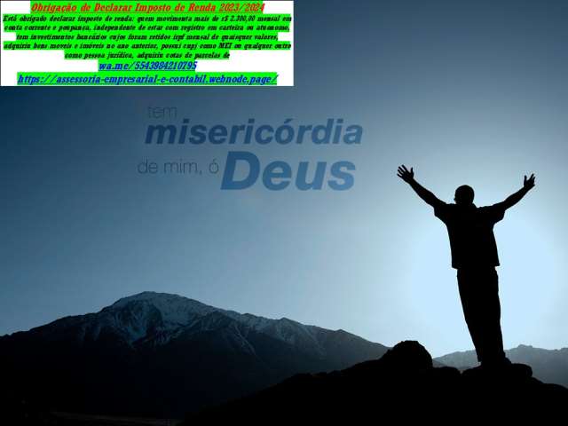 Analista Fiscal - DEVE DECLARAR IRPF 2024; MOVIMENTOU R$ 2.300,00/MÊS Declaração Anual MEI – Entrega/Multa. Consultoria Financeira – Consultoria Tributária e Fiscal – Consultoria Microempresas. Consultoria Empresarial e Contábil e Microempresa–Assessoria tributária recursos humanos–auditoria em f...