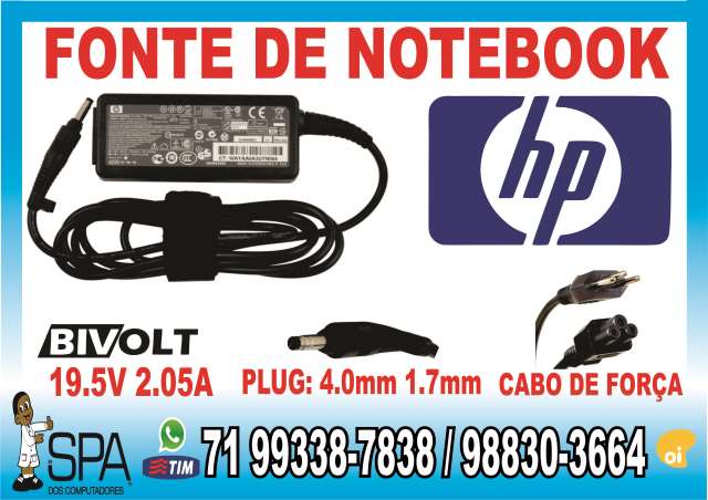 SPA DOS COMPUTADORES (71) 99338-7838 ZAP / 98830-3664 / 99369-9902 ENDEREÇO: RUA LAURO DE FREITAS, Nº 103-A, SÃO CRISTÓVÃO SALVADOR-BA. -NOVO -VOLTAGEM: 19.5V -AMPERAGEM: 2.05A -VOLTAGEM DE ENTRADA: 100/240V BIVOLT -CABO DE FORÇA TRIPOLAR -PLUG 4.0mm x 1.7mm -PAGAMENTO EM ESPÉCIE -ACEITAMOS CARTÕ...