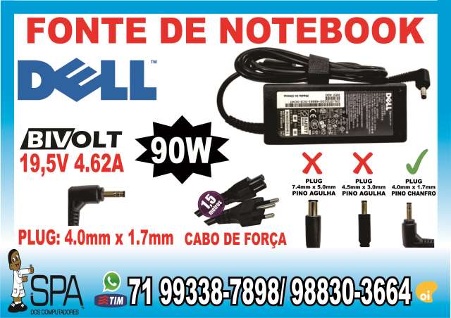 SPA DOS COMPUTADORES (71) 99338-7838 ZAP / 98830-3664 / 99369-9902 ENDEREÇO: RUA LAURO DE FREITAS, Nº 103-A, SÃO CRISTÓVÃO SALVADOR-BA. -NOVO -SEM AGULHA -VOLTAGEM: 19.5V -AMPERAGEM: 4.62A -POTÊNCIA: 90W -PLUG 4.0MM x 1.7MM -VOLTAGEM DE ENTRADA: 100/240V BIVOLT -CABO DE FORÇA TRIPOLAR -PAGAMENTO ...