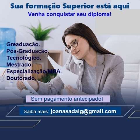 Temos uma oportunidade ótima para você e seus dependentes decolar na sua carreira profissional; Temos cursos de GRADUAÇÃO EAD, PÓS EAD, R2 EAD e SEGUNDA GRADUAÇÃO EAD para você que já possui uma. Podendo concluir em poucos dias! Faça a sua graduação EaD com uma das melhores faculdades a distância...